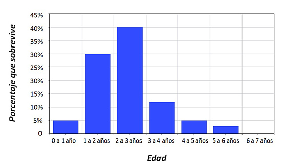 22. Andrea ha buscado información sobre el número de años que vive un hámster. Con la información que ha encontrado ha dibujado el siguiente gráfico, en el que representa el porcentaje de hámsteres que sobreviven según la edad: