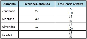 24. Juan ha construido una tabla de datos con los gramos de comida de cada tipo que ha comido el hámster durante la primera semana y ha calculado la frecuencia relativa. Pero al pasarla a limpio ha olvidado un dato.