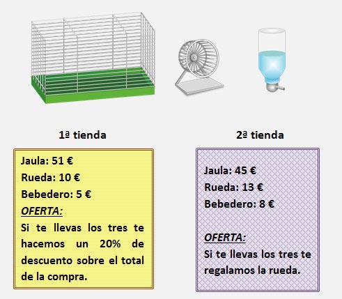 En principio, necesitan: una jaula, un bebedero y algún accesorio para hacer ejercicio. Dos tiendas cercanas tienen la misma jaula, la misma rueda y el mismo bebedero, pero con diferentes precios y ofertas: